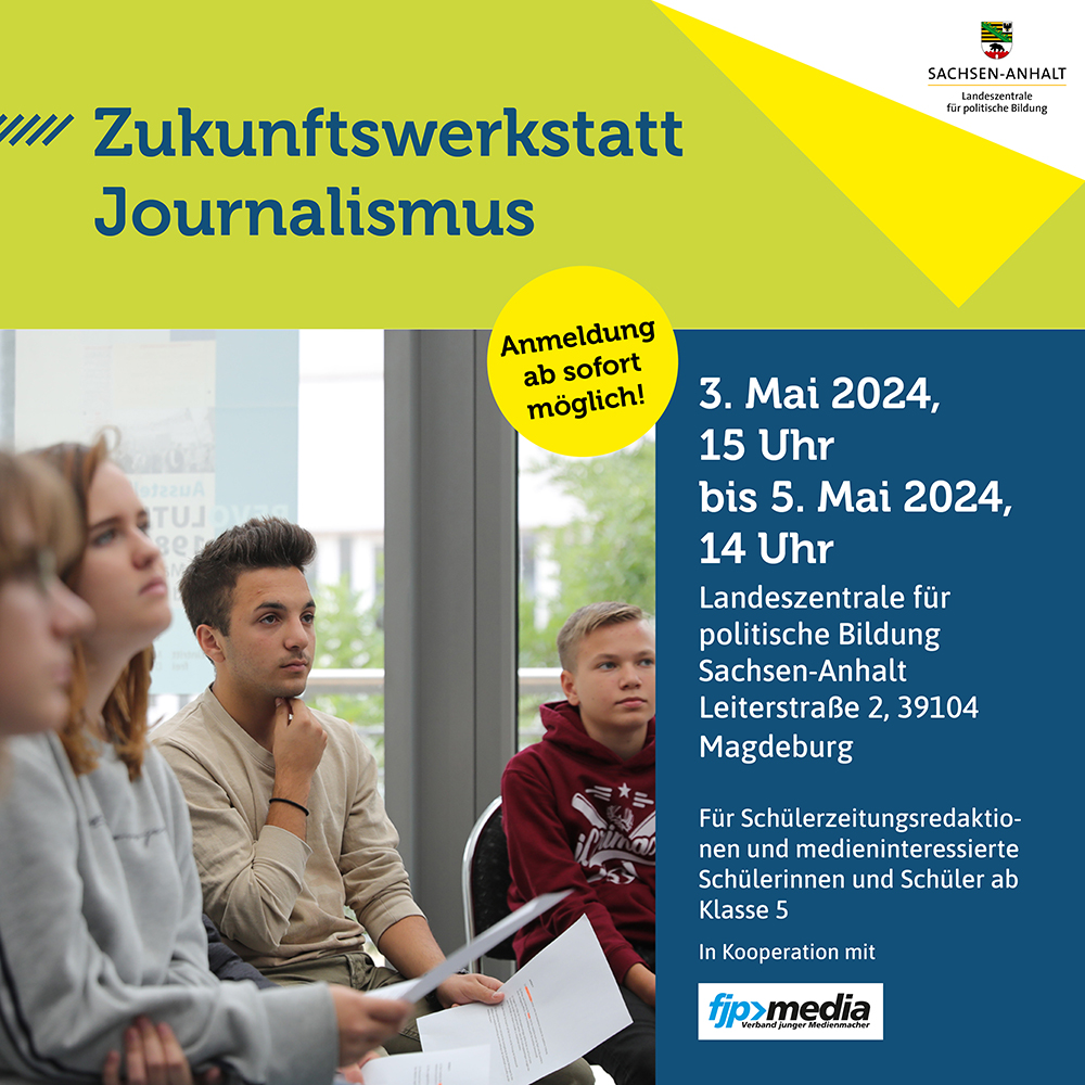 Vom 3. bis 5. Mai laden der Jugendmedienverband fjp>media und die Landeszentrale für politische Bildung Sachsen-Anhalt Schülerzeitungen und medieninteressierte Schülerinnen und Schüler zur „Zukunftswerkstatt Journalismus“ nach Magdeburg ein. Gemeinsam mit Medienprofis von Volksstimme, Mitteldeutscher Zeitung und mdr wollen die Veranstalterinnen erkunden, welche Bedeutung Journalismus im digitalen Zeitalter hat. Was hat sich verändert? Welche Potenziale hat die lokale Berichterstattung? Vor welche Herausforderungen stellt die Digitalisierung den Journalismus und vor allem: Was erwarten junge Menschen in Zukunft von den Medien“?