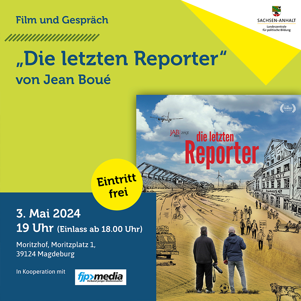 An dem Wochenende steht einiges auf dem Programm: Los geht es am Freitag mit einem Filmabend im Moritzhof in Magdeburg, gezeigt wird der Film „Die letzten Reporter“, an dessen Anschluss sich ein Filmgespräch anschließt. Eingeladen sind alle Interessierten und um Anmeldung wird gebeten.