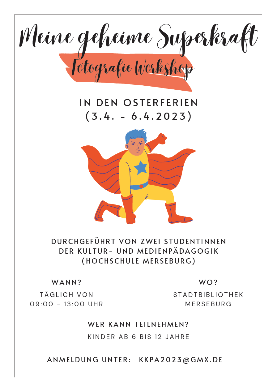 Studentinnen der Kultur -und Medienpädagogik an der Hochschule Merseburg laden in den Osterferien (3. bis 6. April 2023) zu einem Fotografie-Workshop für Kinder zwischen 6 und 12 Jahren in die Stadtbibliothek „Walter Bauer“ in Merseburg ein.