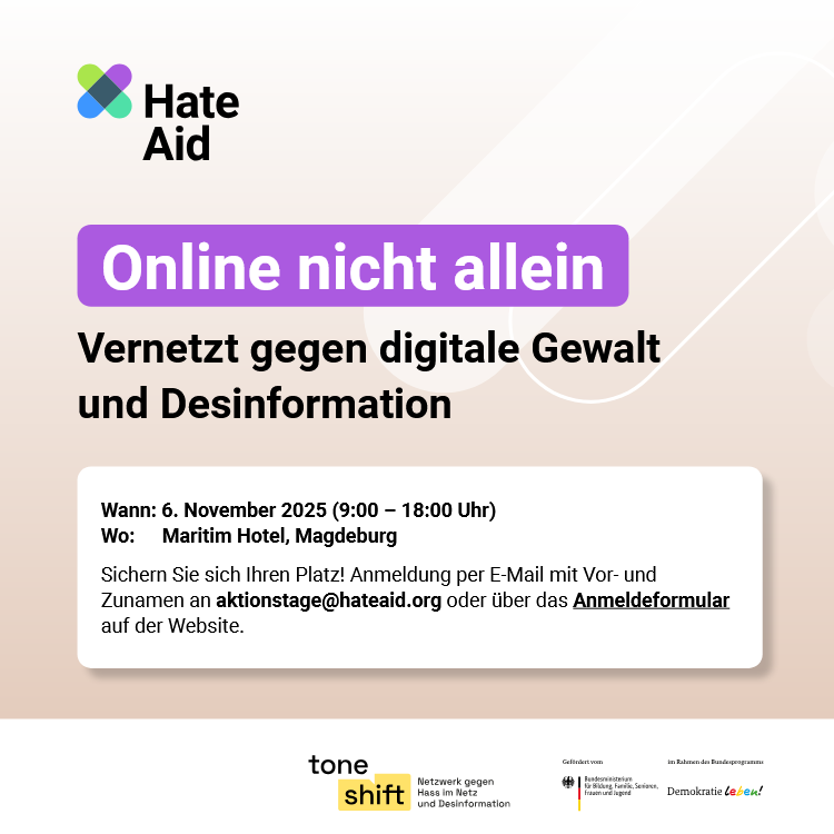 Deshalb lädt HateAid am 6. November lokal Engagierte aus Politik, Verwaltung und Zivilgesellschaft zu dem Aktionstag gegen digitale Gewalt und Desinformation in Magdeburg ein. Gemeinsam soll ein Raum für Austausch, Wissenstransfer und konkrete Strategien im Umgang mit digitaler Gewalt geschaffen werden. Seien Sie dabei – die Teilnahmeplätze sind begrenzt.